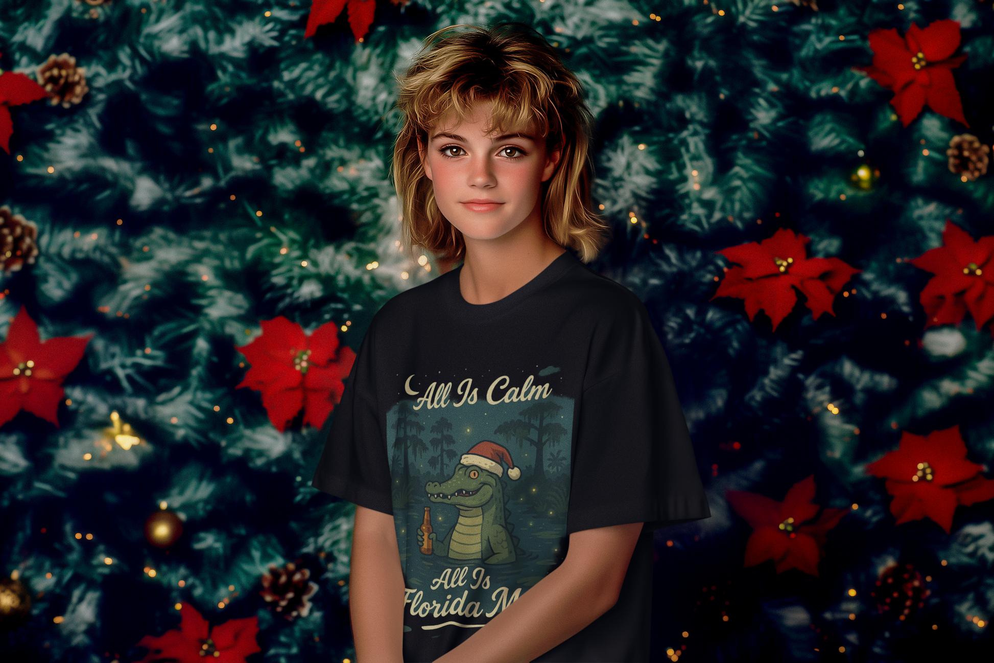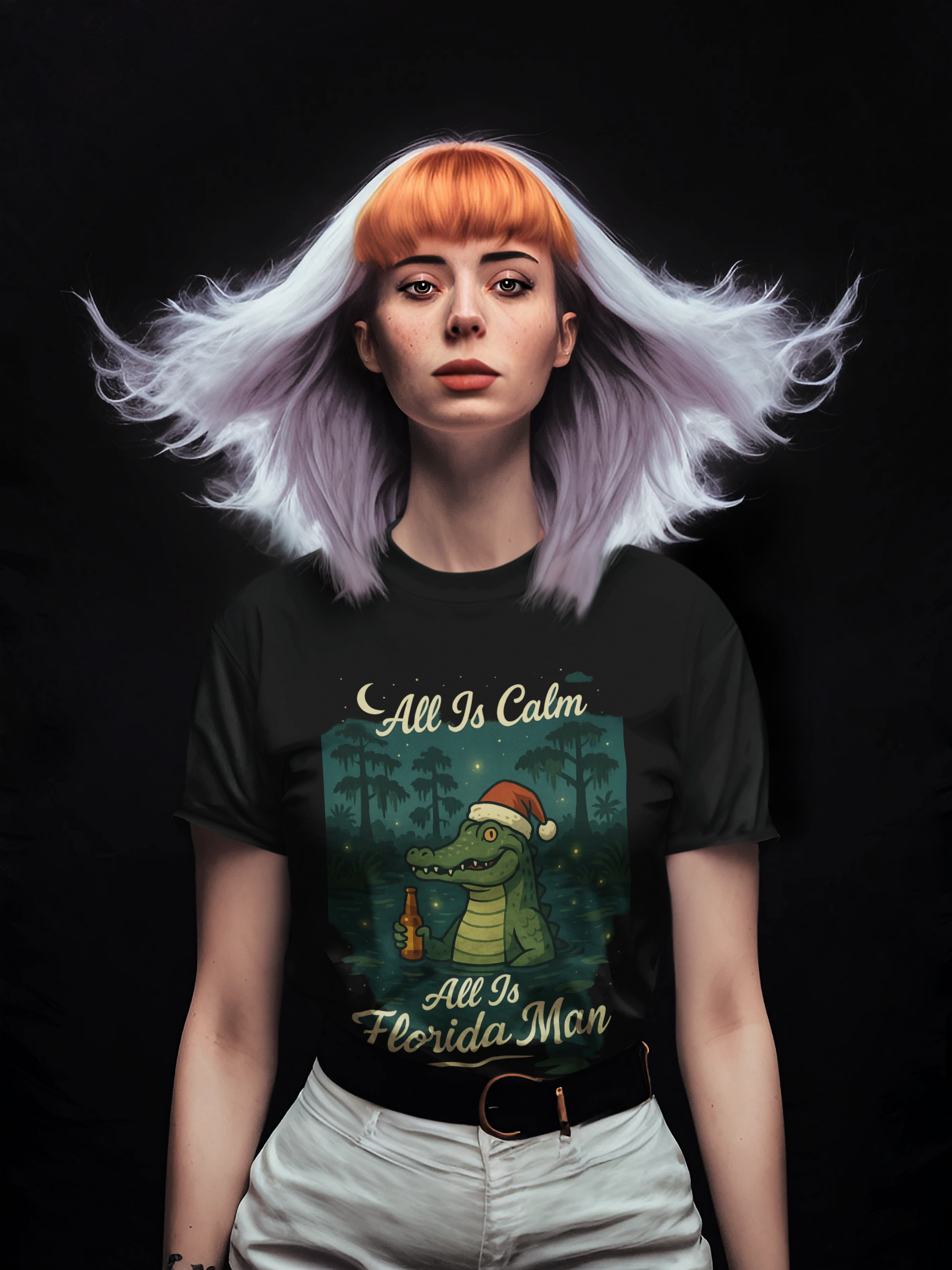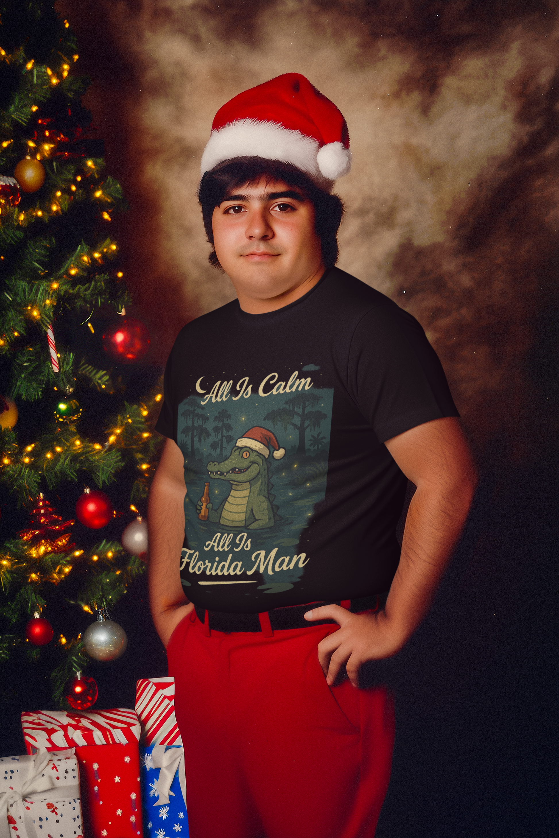 All Is Calm, All Is Florida Man” Shirt – Black Short Sleeve Tee | Funny Florida Christmas Gator Shirt | Funny Florida Shirt