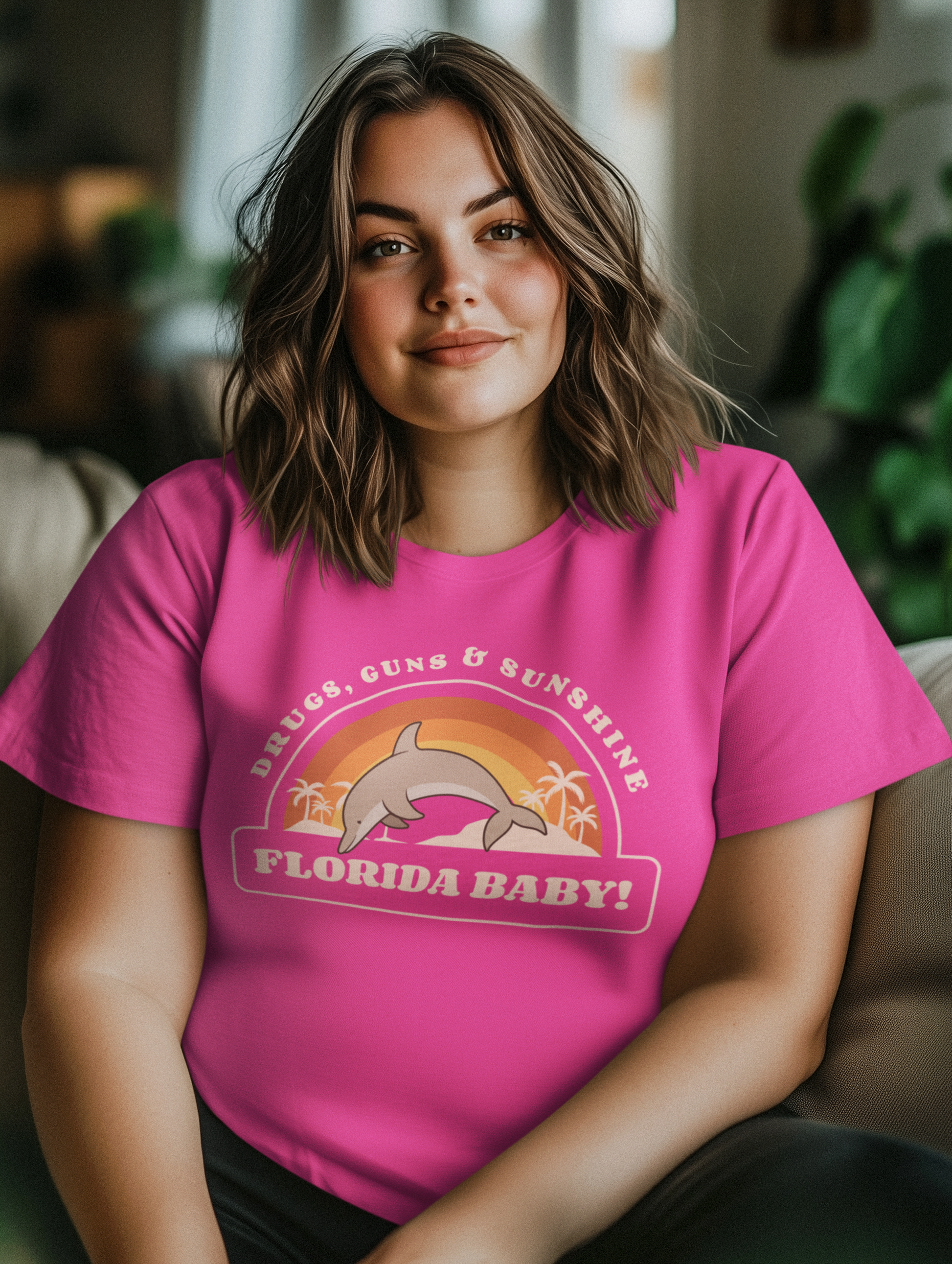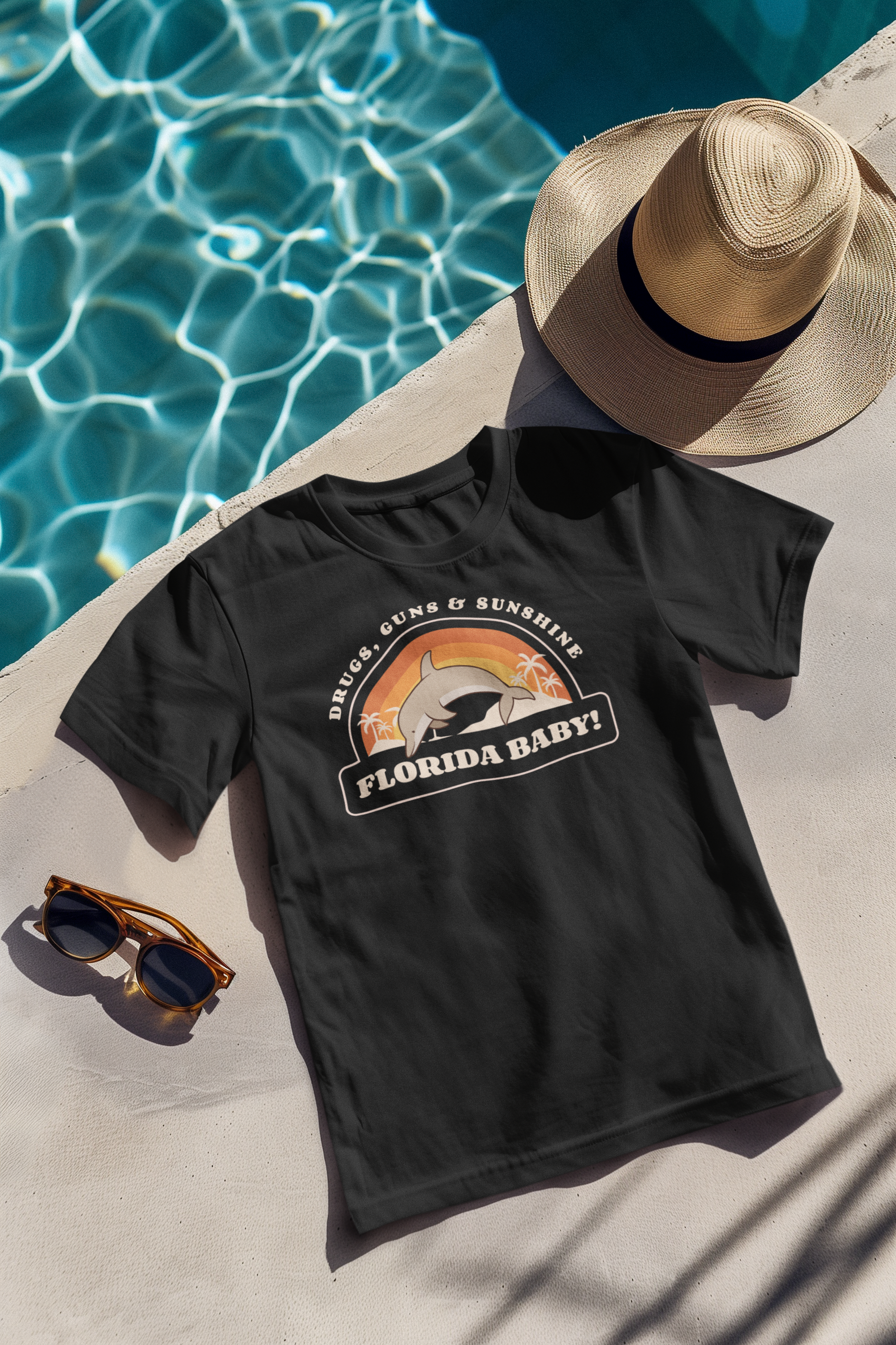 Introducing the "Drugs, Guns & Sunshine – Florida" shirt — a wild, darkly funny graphic featuring a dolphin shredding waves under a blazing sun. Whether you're a native, a transplant, or just someone who knows Florida's chaotic energy, this shirt is the perfect way to show your dark-humor pride.