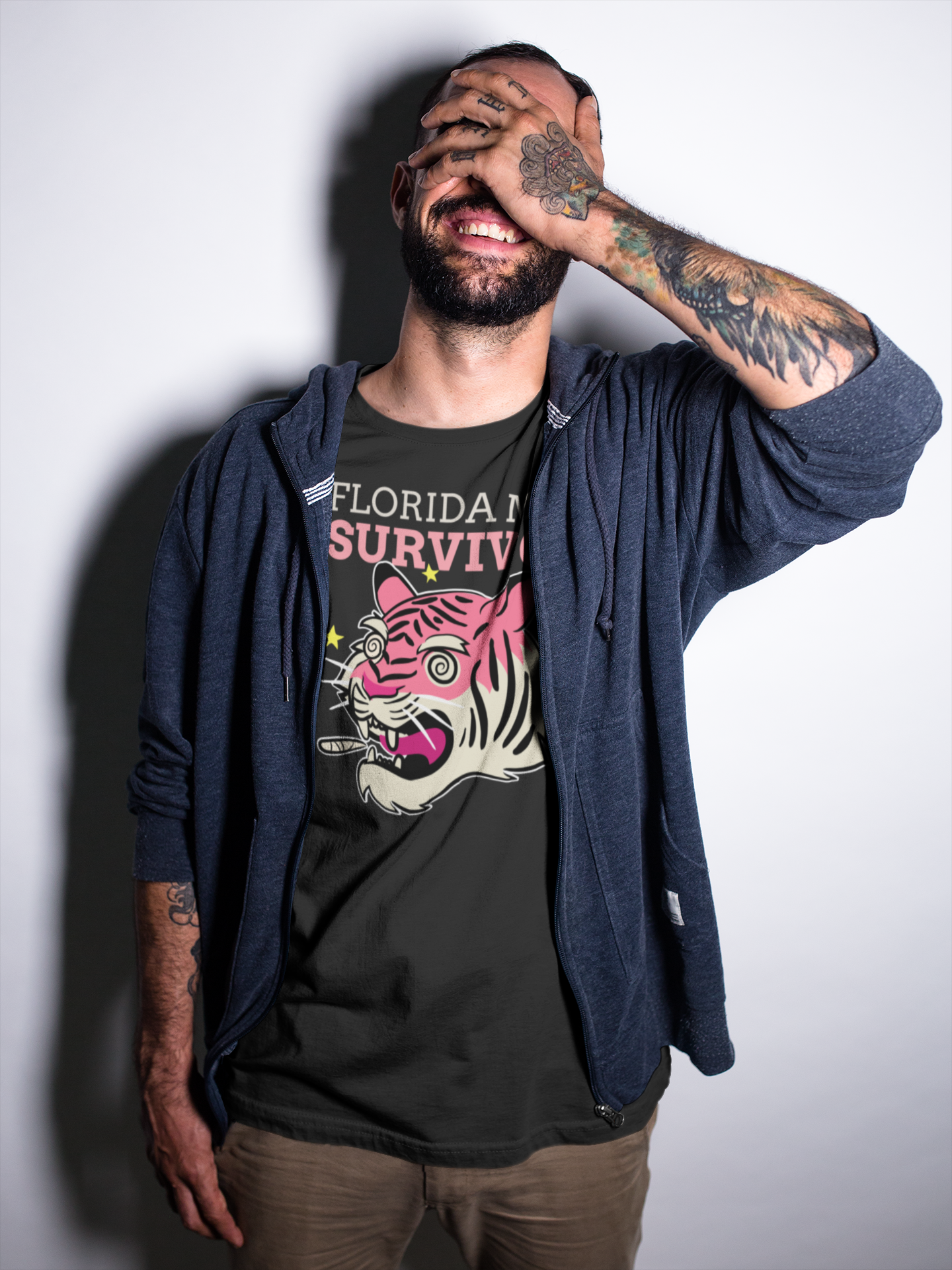 From hurricane wrestling to gas station showdowns and wild nights with Florida wildlife, only the toughest make it out. This "Florida Man Survivor" tee features a dazed, wild-eyed tiger, a nod to the legendary Florida chaos that few escape unscathed.
