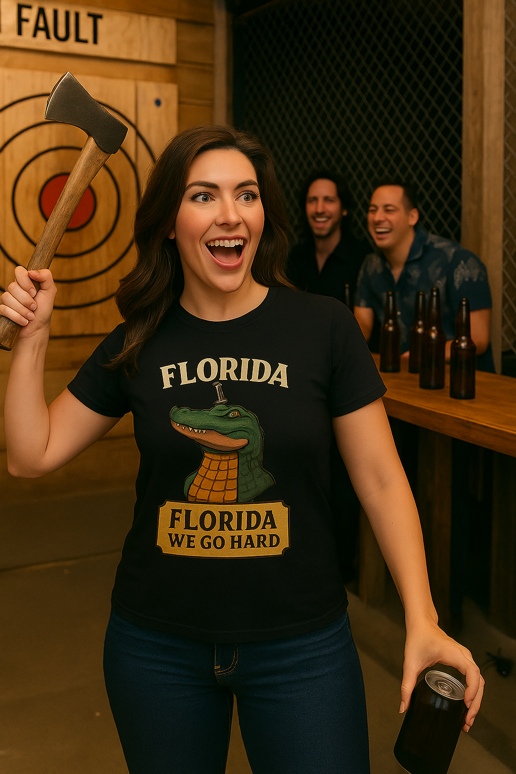 This isn’t just a shirt—it’s a survival badge. Featuring a bold cartoon alligator with a knife in its head and zero concern in its eyes, this design perfectly sums up the spirit of the Sunshine State: resilient, wild, and completely unbothered.