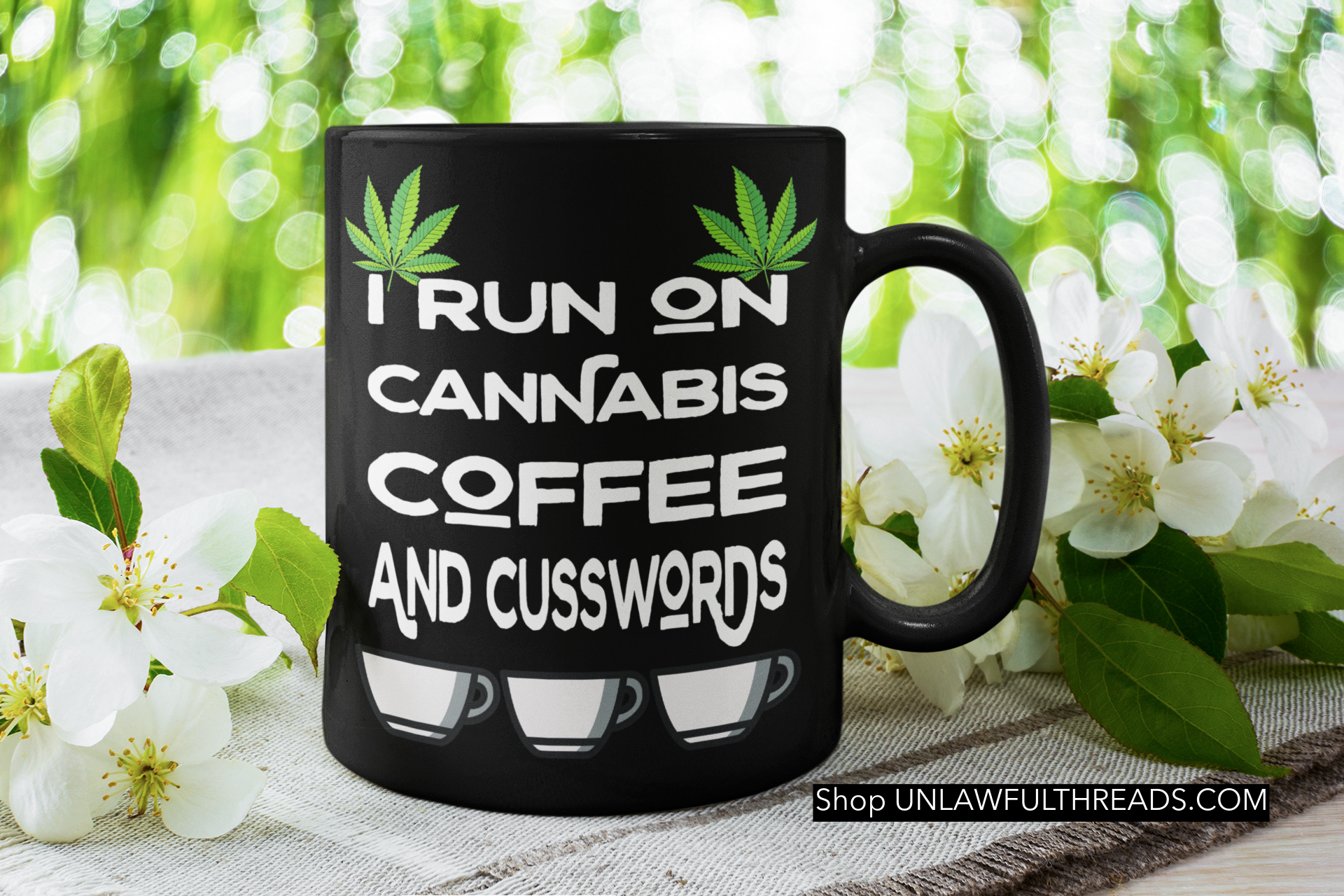 I run on Cannabis Coffee and Cusswords Sweet Leaf edition coffee mug 15 ounces