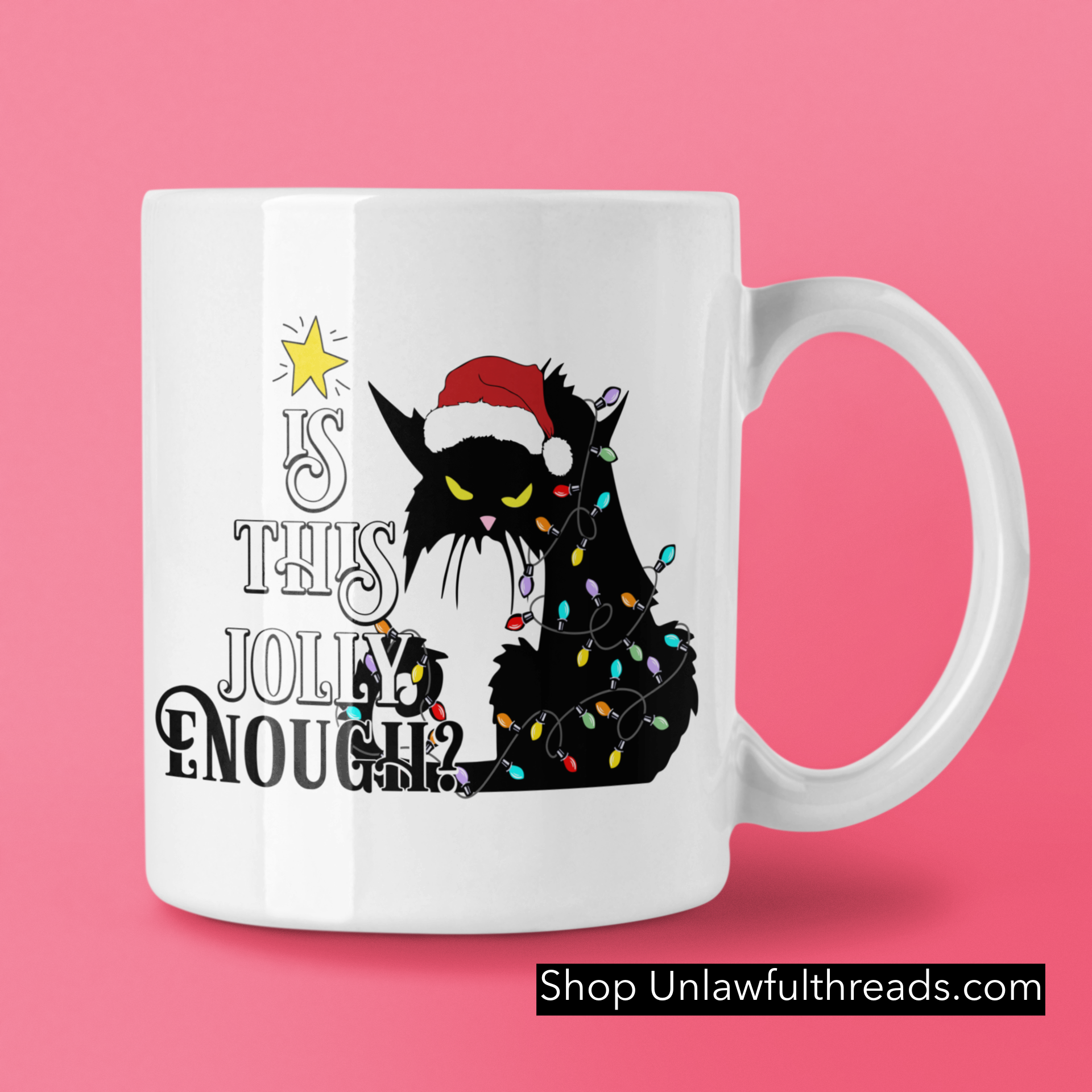 IS THIS JOLLY ENOUGH? angry cat coffee mug white 15 ounces