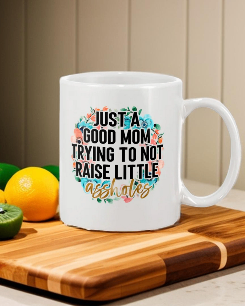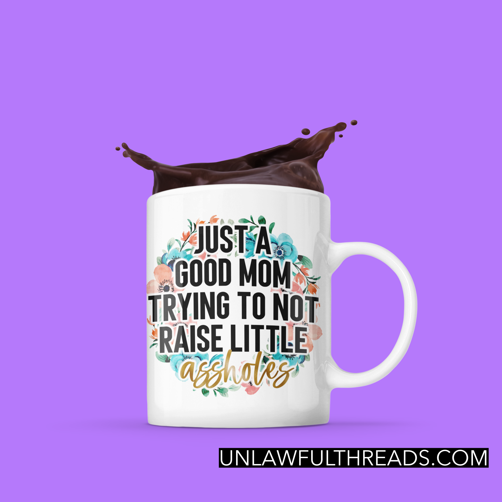 Just A Good Mom trying to Not Raise Little Assholes coffee mug 15 ounces