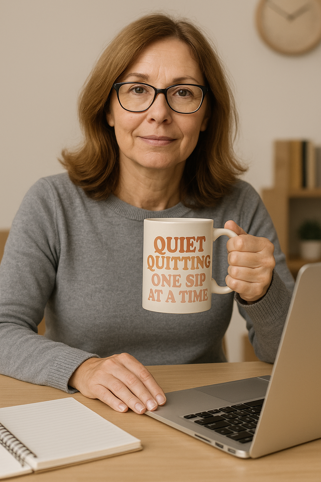 This “Quiet Quitting One Sip at a Time” mug is your daily reminder that boundaries are beautiful, burnout is boring, and the only thing you owe before 9 AM is a hot beverage. Featuring soft retro lettering in calming neutrals, it’s the passive-aggressive desk accessory you didn’t know you needed.