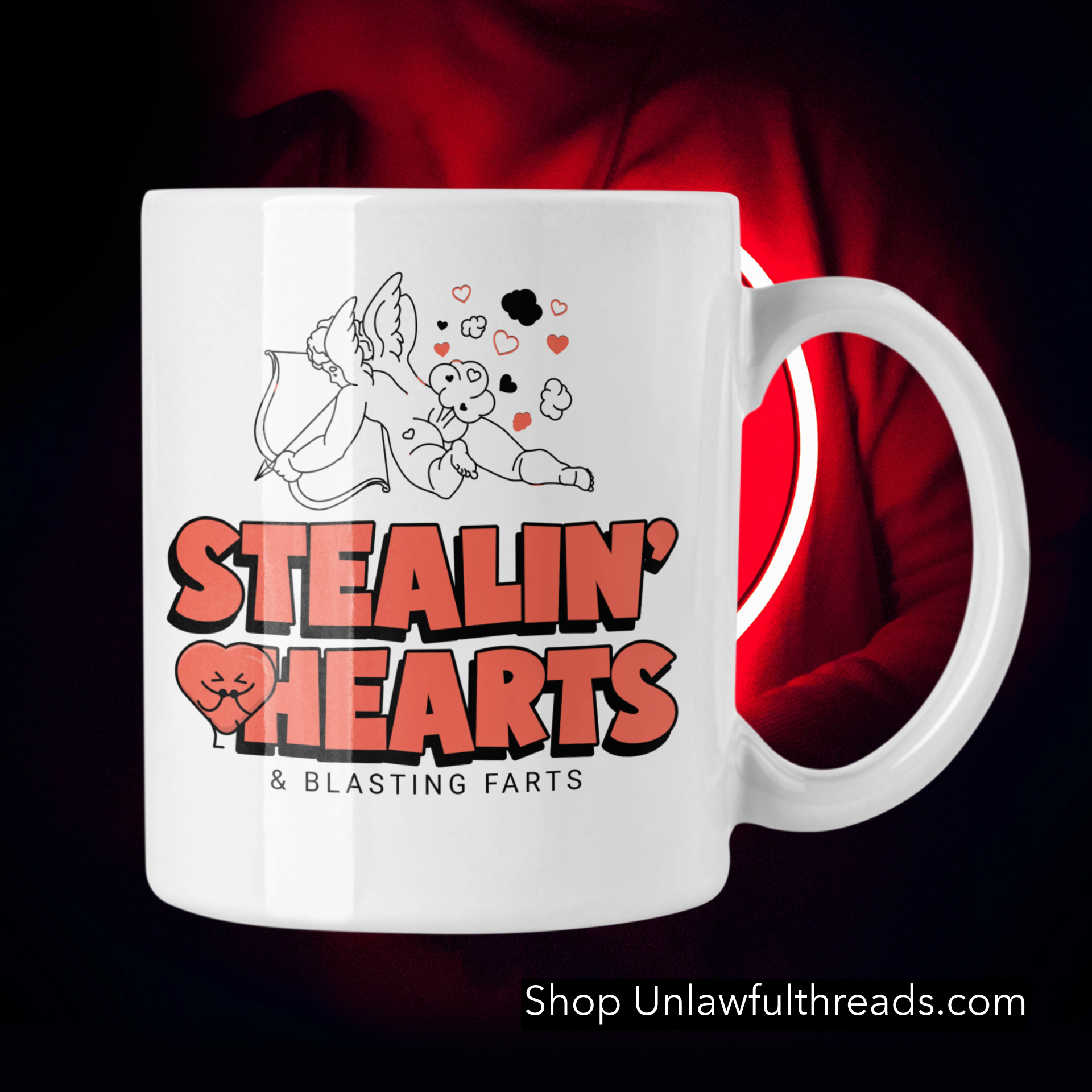 Stealin Hearts and Blastin Farts white 15 ounce ceramic coffee mug