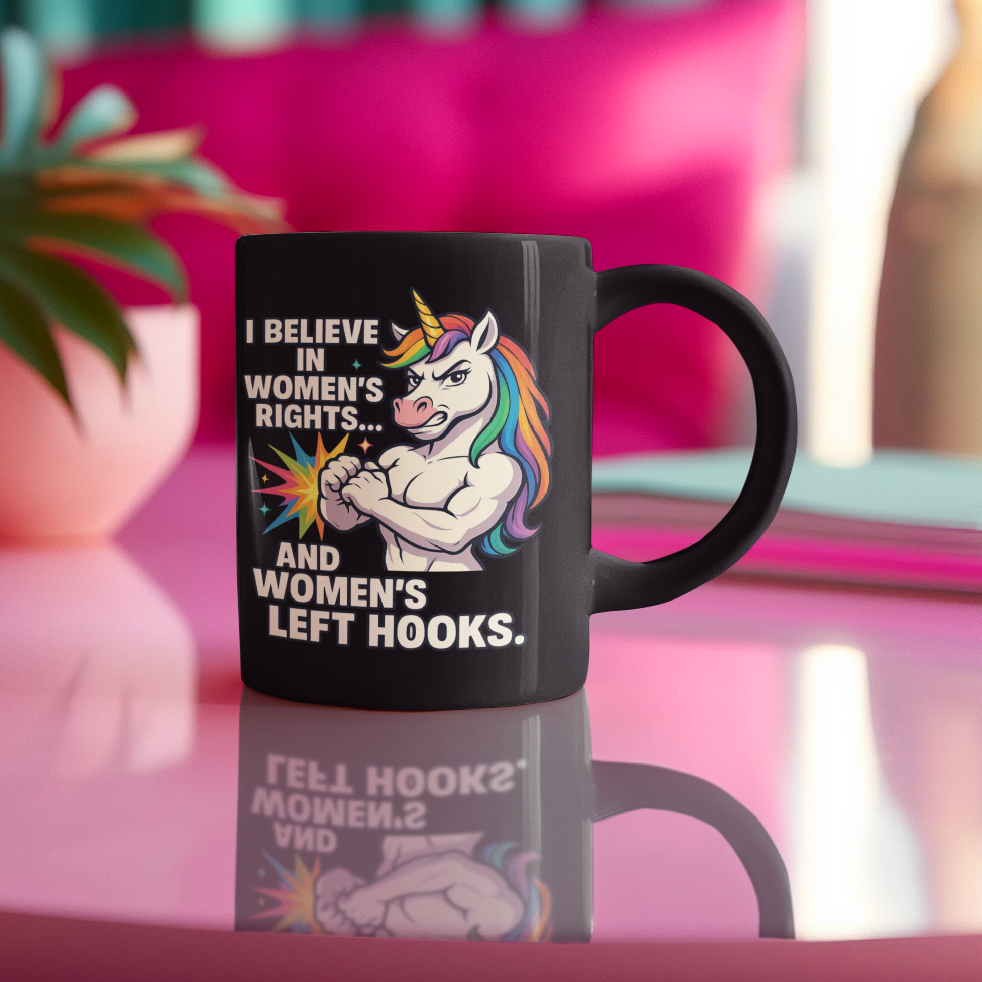 🦄💥 “Women’s Rights & Women’s Left Hooks” – Black 15oz Ceramic Mug