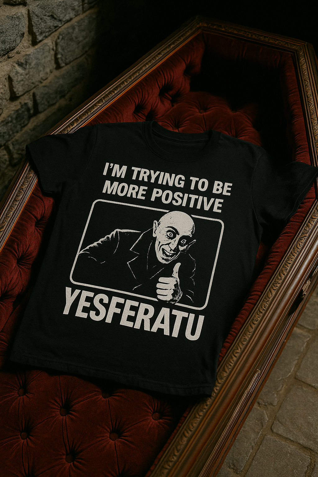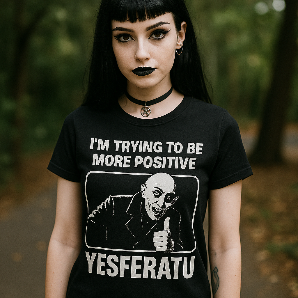 This undead classic features the one and only Yesferatu—Nosferatu’s slightly more optimistic cousin—flashing a thumbs up while dead inside (and outside). Perfect for goths with a sense of humor, horror nerds, and introverts forced to leave the crypt.